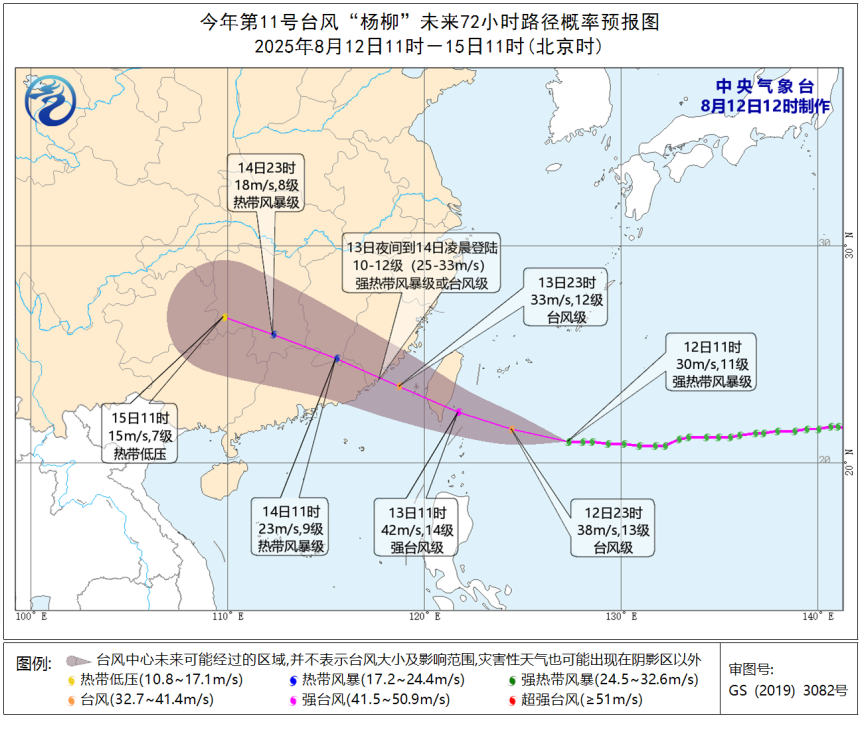 中央气象台8月12日6时发布台风黄色预警。12日8时,今年第11号台风“杨柳”(强热带风暴级,11级,30m/s,980hPa) 距离台湾台东市东偏南方向约730公里。