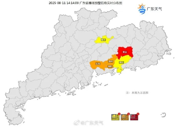 截至今天14点14分,河源市紫金暴雨红色预警生效中;东莞、惠州、惠阳暴雨橙色预警生效中;惠东、新丰暴雨黄色预警生效中,另有6个市县雷雨大风黄色预警生效中。