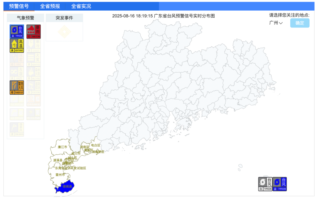 8月16日下午,又有一个热带低压系统在南海生成。中央气象台预计,该系统可能维持热带低压强度,在17日夜间至18日早晨登陆海南岛南部到广东西部沿海。在广东,西部沿海地区在16日傍晚起陆续发布台风预警信号。广东省气象台16日预计,17日至19日,广东局地将因季风槽和南海热带低压,出现大雨到暴雨局部大暴雨天气。根据中央气象台观测,南海热带低压中心在16日17时位于海南省三沙市(西沙永兴岛)东南方约140公里的海面上,中心附近最大风力6级(12米/秒)。预计该低压将以每小时10-15公里的速度向西北方向移动,逐渐向海南岛南部到广东西部一带沿海靠近,强度变化不大,可能于17日夜间至18日早晨在上述沿海登陆(6-7级,12-15米/秒,热带低压),登陆后继续向西北方向移动,强度逐渐减弱。8月16日傍晚起,广东西部沿海地区已陆续发布台风预警信号。截至16日18时19分,东起电白西至徐闻的沿海地区已发布台风白色或更高级别预警信号,其中徐闻直接发布台风蓝色预警信号。