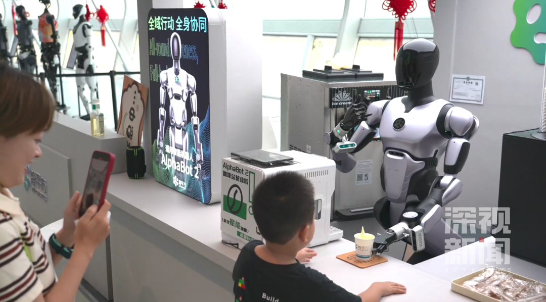 赛场外,来自深圳的机器人也同样忙碌不停。这款名叫“爱宝”的机器人,正娴熟地为顾客制作免费的冰淇淋和咖啡。前来领取冰淇淋的观众表示,机器人很帅,而且制作速度很快,不到一分钟就拿到了。智平方(深圳)科技有限公司CEO助理马靓婧表示,未来会有更多的新科技消费场景,让机器人走进千家万户。