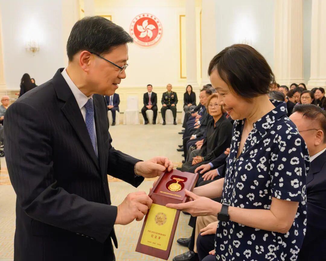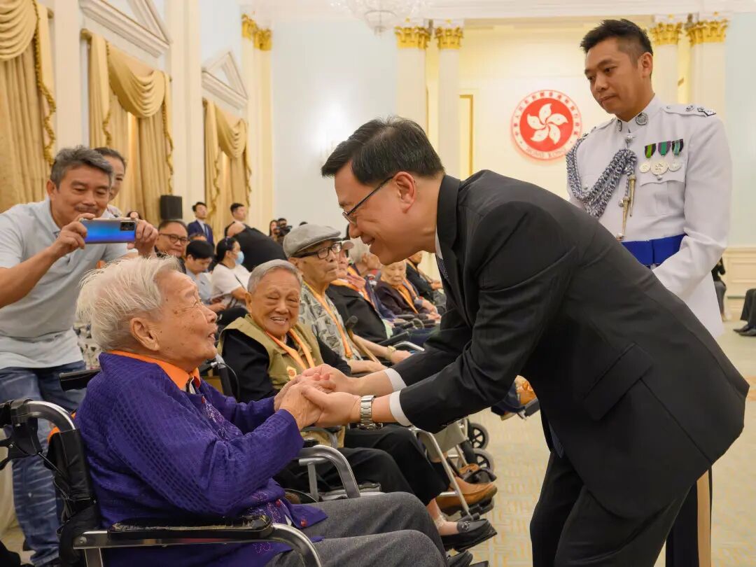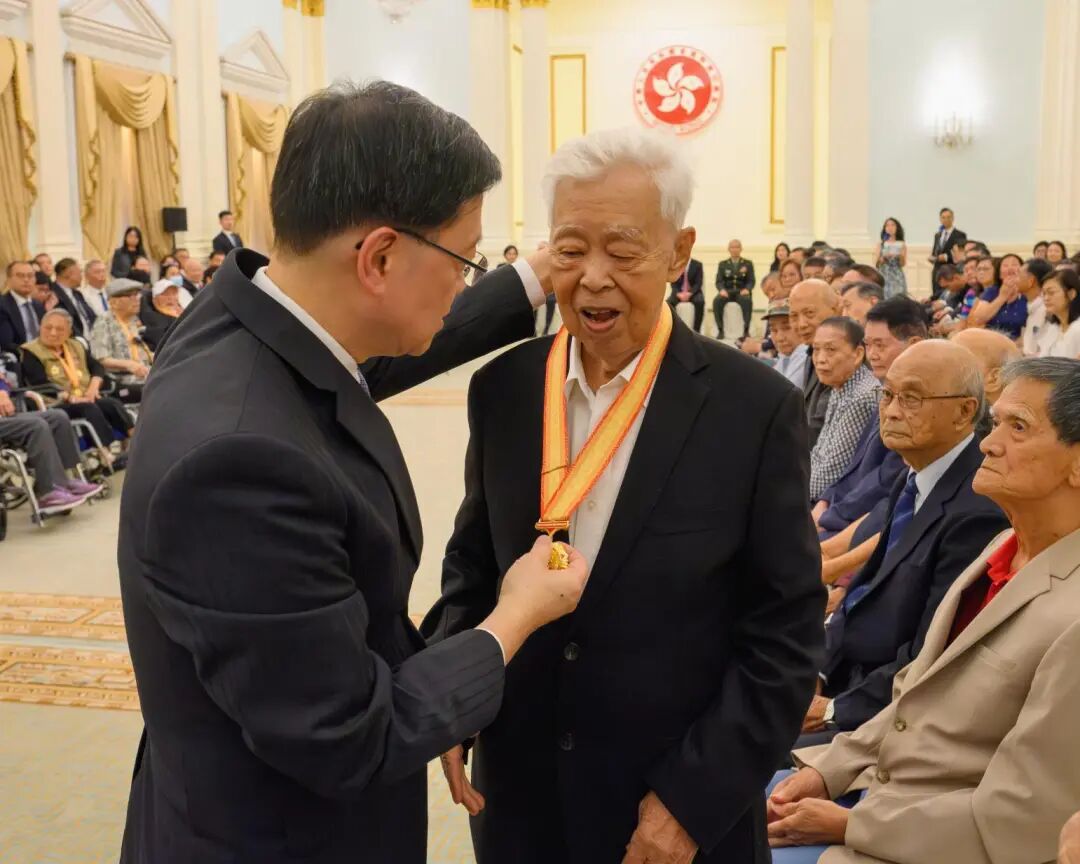 香港特别行政区政府昨日(22日)于香港礼宾府举行“中国人民抗日战争胜利80周年纪念章颁授仪式”。为表彰在港健在并曾参加抗战的老战士、老英雄,抗战将领或其遗属,颁发由国家授予的纪念章,弘扬抗战精神,深化社会对历史的认识及爱国情怀。