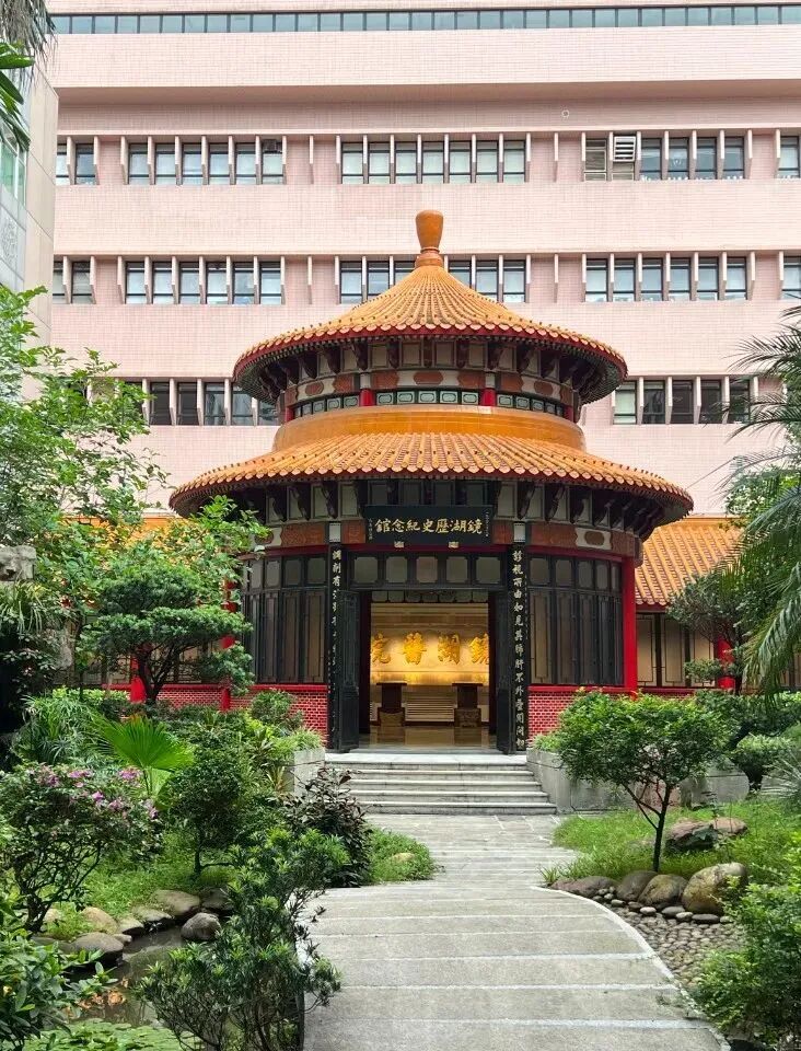 此外还有一个鸟语花香的小型中式花园,而主道两侧则嵌刻了医院的碑志和一块刻着光绪十年“炙光希义”的牌匾。这里原不作对外开放,后经扩建,到2001年时始对外开放,改建后比原来面积大了约4倍之多(531平方米),馆内可分为3部分,包括中庭、右展室及左展室。中庭摆放了1872年“镜湖医院”石刻、1893年的“旨建坊”、《倡建镜湖医院碑记》以及何贤、柯麟、林炳炎三位已故主席的半身铜像和各式印章等。