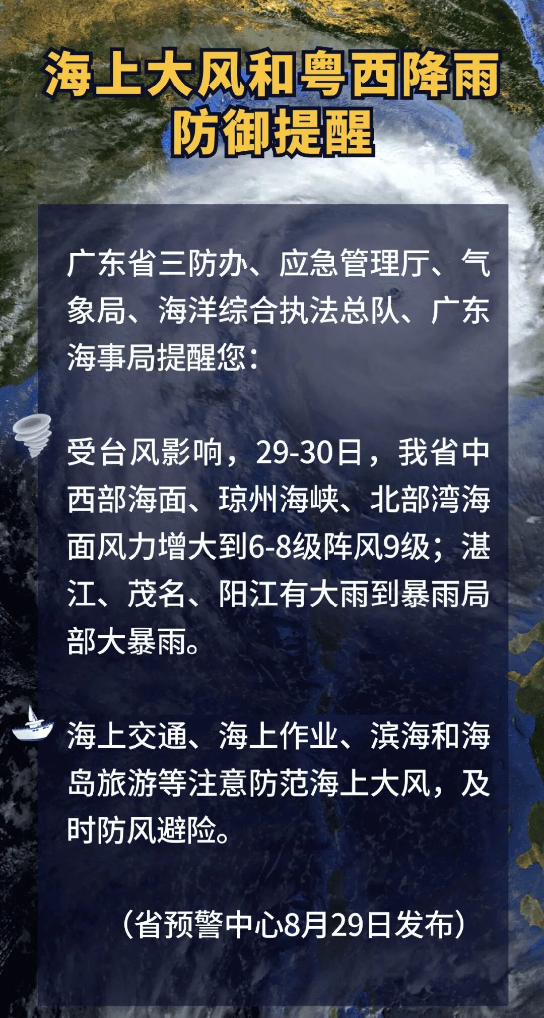 广东省防汛防旱防风总指挥部办公室(以下简称“省三防办”)28日已印发通知,阳江以西(含阳江)海域于8月29日12时前落实防台风“六个百分百”措施。广东省预警中心29日发布海上大风和粤西降雨防御提醒。