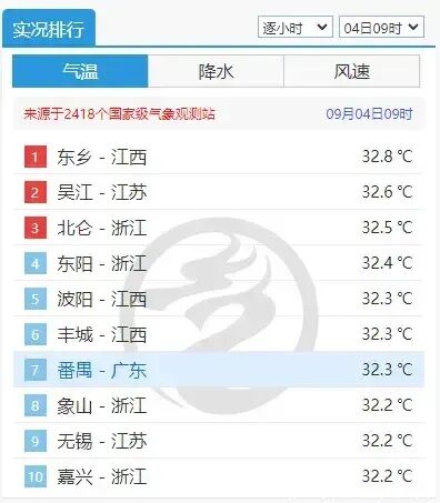 昨天一大早,广东已经开始热气蒸腾。9月4日8时汕尾、番禺、东莞、珠海的气温齐刷刷30℃。番禺更是凭32.3℃的实力,荣登全国气温榜的第七名。
