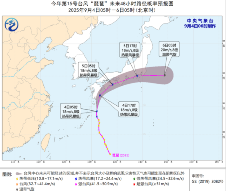 琉球群岛以东洋面的热带低压昨日(4日)凌晨加强为今年第15号台风“琵琶”,凌晨5点钟其中心位于日本鹿儿岛偏南方向约275公里的洋面上。预计“琵琶”将以每小时25-30公里的速度向北偏东方向移动,强度变化不大,逐渐趋向日本九州岛南部洋面。