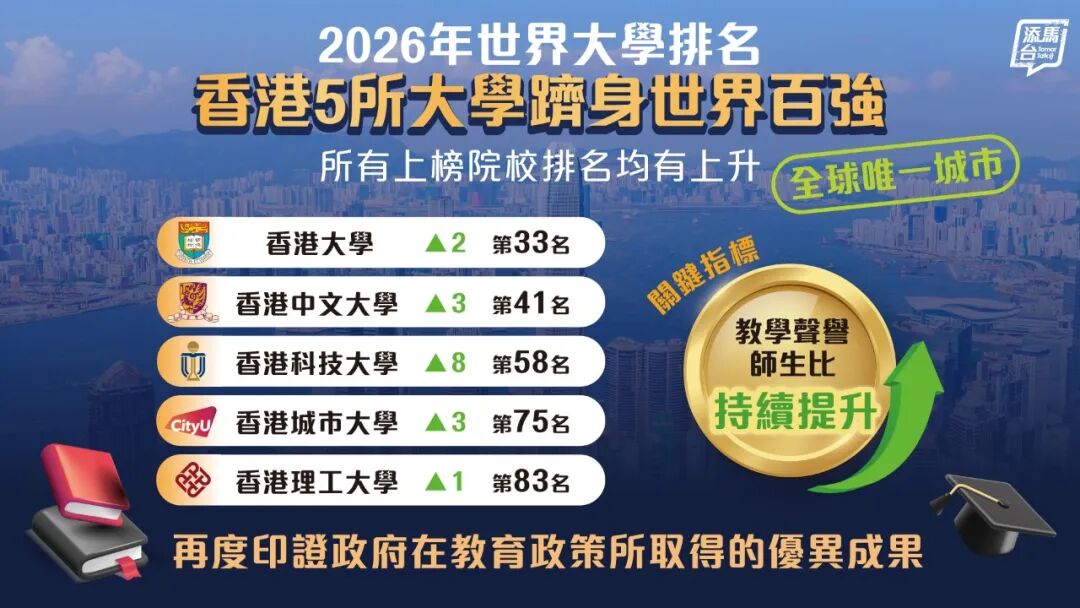 英国泰晤士高等教育最新公布的2026年世界大学排名显示,香港高校继续位列顶尖,5所大学跻身世界百强。香港特区政府教育局发言人9日表示,香港高校的排名成绩令人鼓舞,充分肯定香港专上教育界别精益求精、奋发图强的成果,并见证特区政府在建设香港成为国际专上教育枢纽上取得显著进展。发言人表示,根据该排行榜,香港8所获大学教育资助委员会资助的大学榜上有名,其中香港大学上升两位至全球第33名,香港中文大学上升三位至第41名,香港科技大学上升八位至第58名,香港城市大学上升三位至第75名,香港理工大学上升一位至第83名。香港浸会大学由第251至300组别,升至第201至250组别。香港教育大学和岭南大学为新上榜,香港教育大学排第195位,岭南大学在第301至350组别。香港大学校长张翔表示,该校将继续秉持追求卓越的精神,通过顶尖教研成果及创新知识交流,履行作为全球顶尖学府的使命,为香港和国家高质量发展作出更大贡献。香港中文大学校长卢煜明说,此次排名反映该校在教学、研究及国际化方面的持续进步,学校将致力培养具有全球视野、学术卓越并立志回馈社会的未来领袖。香港教育大学校长李子建表示,该校首次参与泰晤士高等教育世界大学排名,位列第195位,学校将继续追求卓越,培育具正向价值观与远见的未来人才,为国家和香港特区作出更大贡献。岭南大学校长秦泗钊表示,该校近年在科研产出与论文被引影响力方面取得显著进展,并致力成为数字时代领先的文理融合研究型博雅大学,深信这些努力将在未来各项国际排名中不断展现成效。