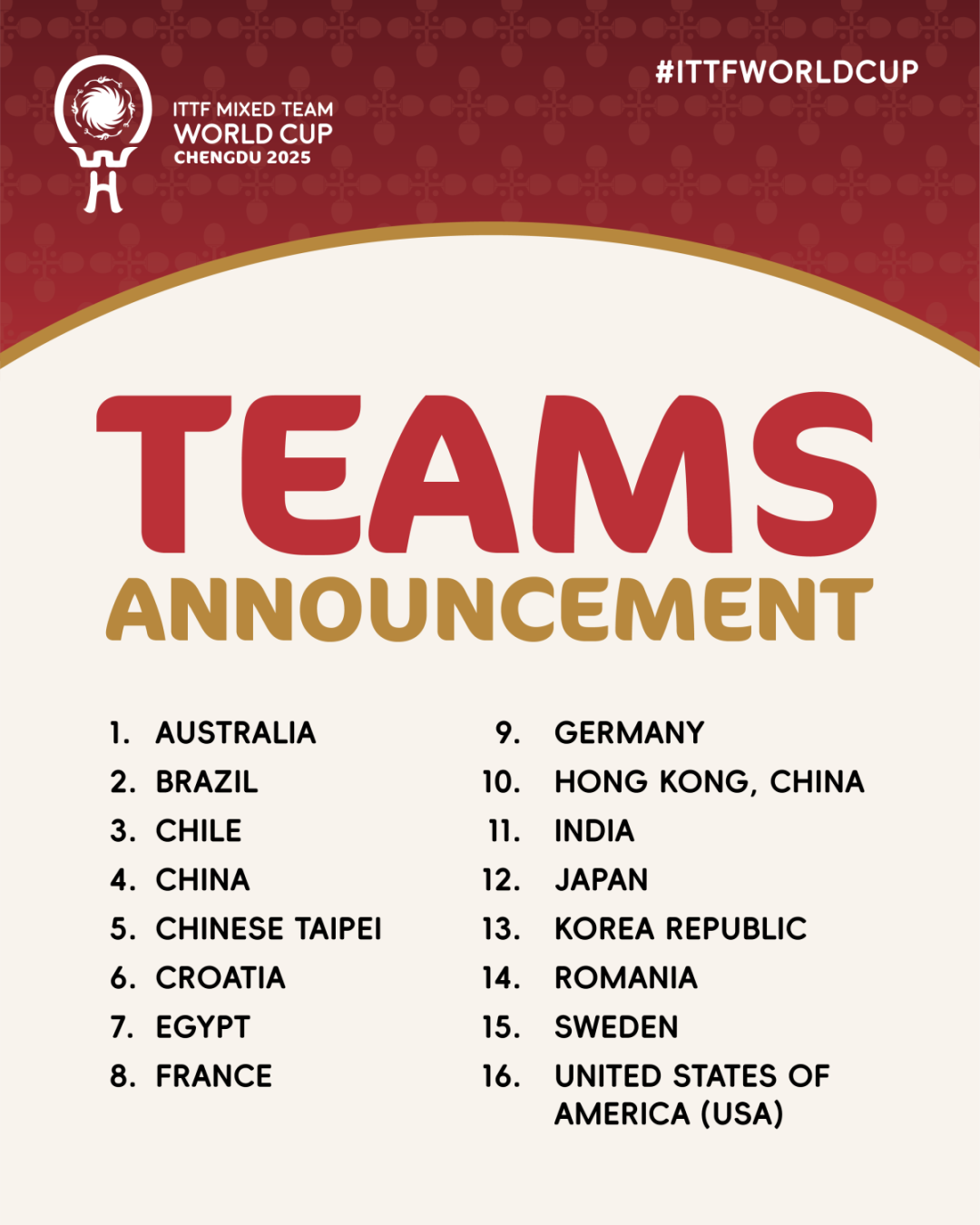 10月7日,国际乒联正式确认了2025年成都混合团体世界杯16支参赛队伍,比赛将于11月30日至12月7日在中国成都举行。随着混合团体项目被正式纳入2028年洛杉矶奥运会,今年的赛事意义非凡。