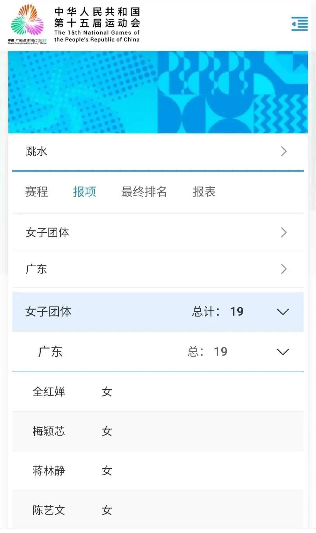 系统显示,广东跳水队将参加十五运会跳水项目的全部14个小项,其中全红婵将出现在女子团体、女子双人10米台、女子10米台3个小项中。