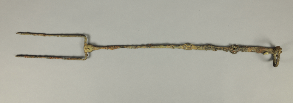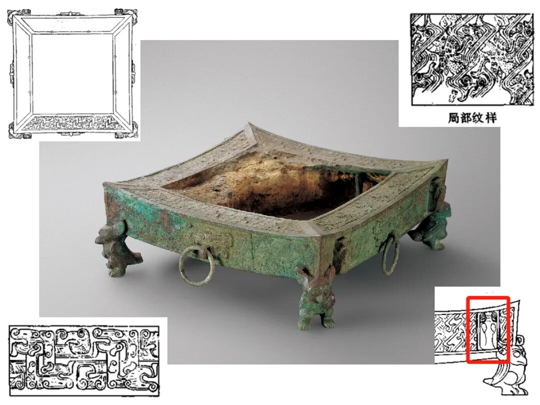 1983年,考古工作者在南越文王墓后藏室清理出土了多种铜烤炉和多件双股铁叉。尤其是下面这组 “烧烤套装” ,堪称专业版本。炉身青铜制成,呈外凸内凹的四方形并带有拉环,炉角上四只造型呆萌、嘟嘴朝天的小猪,不仅是装饰,更是用来插放铁叉的叉座。
