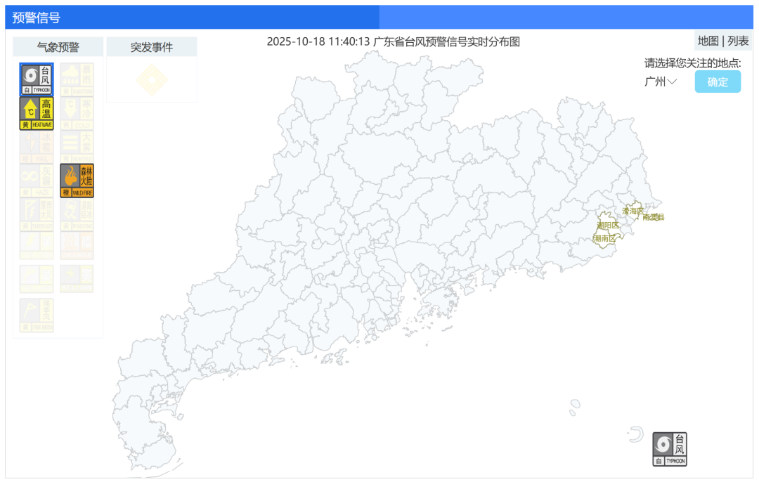 今天(18日)中午,粤东4个站点已悬挂台风白色预警信号。