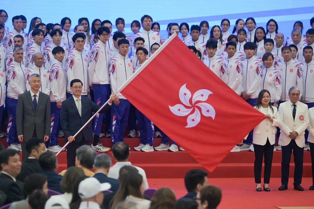 2025年10月15日,中华人民共和国第十五届运动会香港特别行政区代表团授旗仪式在香港九龙公园体育馆举行。