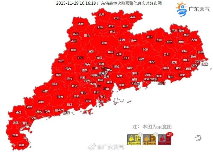 截至今天(29日)10时许,广东全省104个森林火险最高级别红色预警生效中。