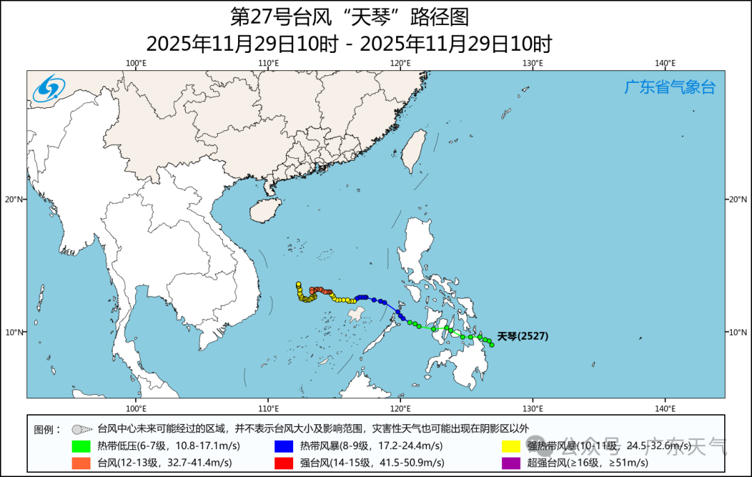 今年第27号台风“天琴”已进入南海,该台风对广东海面和陆地无直接影响,但有可能将部分水汽输送到南粤,在下周初段带来阴雨天气,缓解干燥天气。据“中国天气”消息,未来10天,还有两次冷空气过程(11月29日-12月3日、12月4-6日)影响我国。其中11月29日-12月3日,冷空气将缓慢扩散南下影响中东部大部地区,将带来4℃~6℃,局地8℃~10℃降温,长江以北部分地区并伴有4级~6级偏北风、阵风7级~8级,内蒙古大部及华北北部局地可达9级。广东气象台预计,11月30日-12月1日,广东省转多云到阴天,大部有小雨或零星小雨,早晨大部最低气温明显回升。11月29日,粤西到珠江口西侧市县晴转多云,其余市县晴天为主。最低气温:粤北和珠江三角洲北部市县3~9℃,局部有霜冻,南部沿海市县11~14℃,其余市县9~11℃。11月30日,广东省大部市县多云到阴天,有分散小雨。早晨大部气温明显回升,最低气温:粤北和粤东市县8~12℃,粤西市县17~21℃,其余市县13~16℃。12月1日,粤西和珠江三角洲市县阴天,有小雨,其余市县多云到阴天,有零星小雨。最低气温:南部沿海市县17~21℃,其余大部分市县13~16℃。