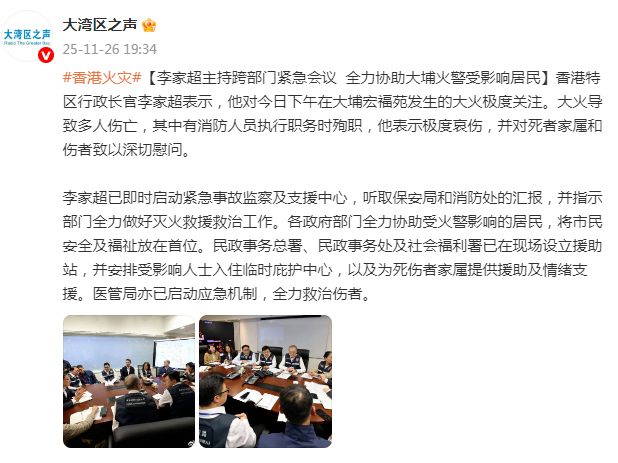 稍早前,香港特区行政长官李家超表示,对今日在大埔宏福苑发生的大火极度关注,已即时启动紧急事故监察及支援中心,并指示部门全力做好灭火救援救治工作。