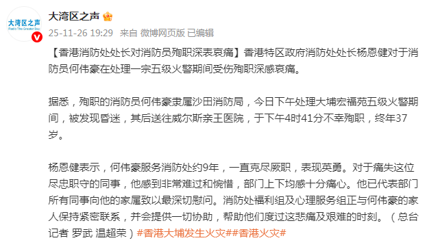 据悉,殉职的消防员何伟豪隶属沙田消防局,今日下午处理大埔宏福苑五级火警期间,被发现昏迷,其后送往威尔斯亲王医院,于下午4时41分不幸殉职,终年37岁。