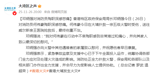 香港特区政府保安局局长邓炳强今日(26日)对消防员何伟豪殉职深感悲痛。何伟豪今日在大埔扑救一宗五级火警时受伤,送往威尔斯亲王医院抢救后,最终伤重不治。