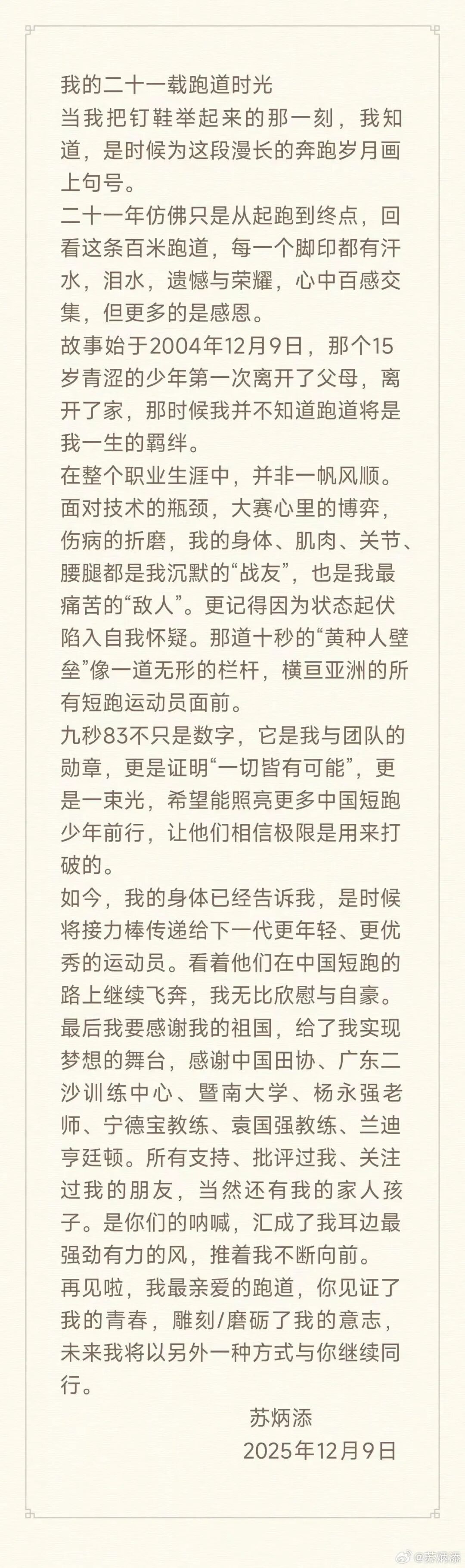 苏炳添在社交媒体平台发布长文,回顾自己的21年的“跑道时光”。
