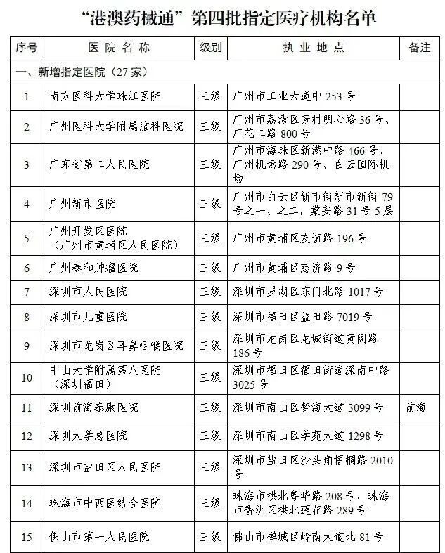 昨日(8日),广东省卫生健康委员会对外发布,根据国家《粤港澳大湾区药品医疗器械监管创新发展工作方案》(国市监药〔2020〕159号)和推进“港澳药械通”实施计划,依据相关法规规定,通过地市评估上报,经审核确定粤港澳大湾区“港澳药械通”第四批指定医疗机构名单,包括新增27家、移出1家。