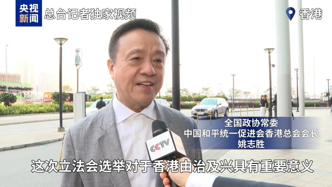 全国政协常委、中国和平统一促进会香港总会会长姚志胜表示,这次立法会选举对于香港由治及兴具有重要意义。“我们踊跃投票,选出香港高质量、高水平的立法会,为香港繁荣作出贡献,为‘一国两制’行稳致远贡献重要的力量。”