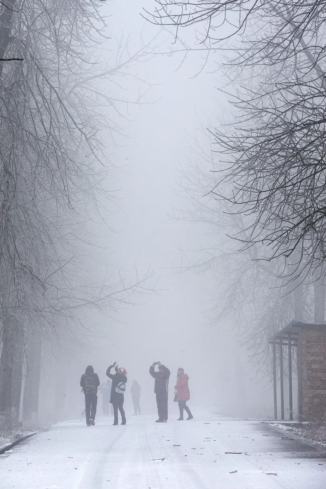 2016年1月23日,广东韶关,乳源县柯树下村通往红云村的路上,一路两旁的树木出现挂冰,两名赏雪的游客不约而同地举起手机拍照。