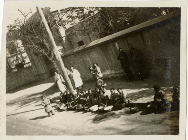 难民区里面有很多竹棚子,还有红十字旗帜,每天靠救济的稀饭度日。日本兵经常进去抓人、拖妇女,有时就在墙边强奸妇女,有的小女孩也被拉去强奸。当时,我母亲她们脸上都涂着黑锅灰……