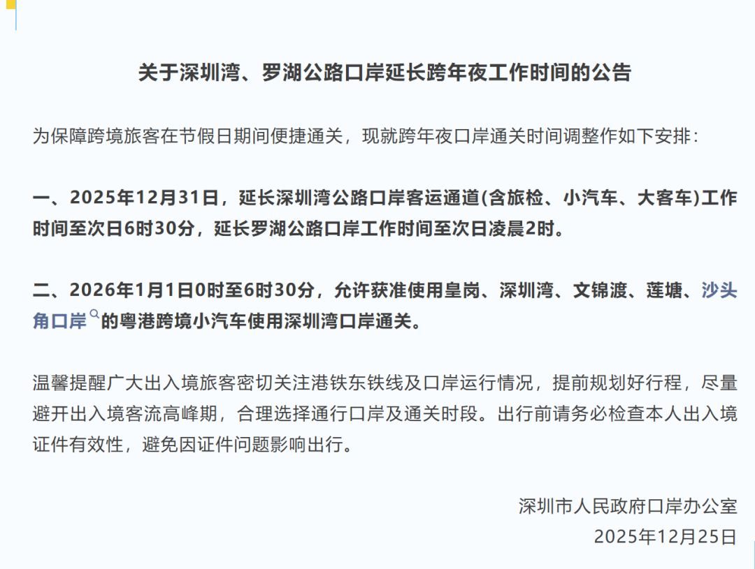 (二)深圳湾口岸的旅客和客车清关服务从原来凌晨12时关闭,改为通宵服务,即24小时运作。