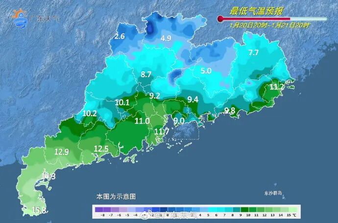 广东省气象局预计,此轮冷空气过程最低气温将出现在22日前后,21日至23日,粤北将有大范围5℃以下低温,粤北高海拔山区-4至0℃,有雨夹雪或冻雨。