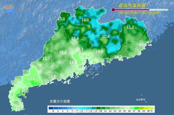 1月16日,粤西、肇庆、云浮、清远、韶关和粤东市县晴到多云,其余市县晴天间多云。粤西和珠三角西部市县早晚有(轻)雾。最低气温:粤北和珠三角北部市县7~11℃,雷州半岛17~19℃,其余市县12~15℃。
